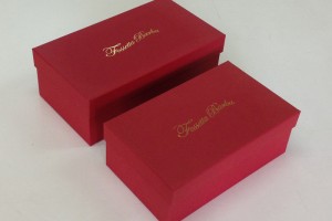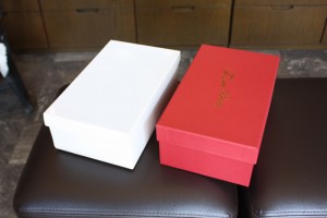 靴屋さんでよく見るボール紙でできた白い、靴屋さんで靴を購入するとショップの店員さんから聞かれる「箱はどうされますかぁ?不要なら処分しておきますよぉ・・・」そう、あれです。この箱は量産タイプの箱で、製作するのにある程度の数量が必要、その代わりにコストが安いことがメリットです。