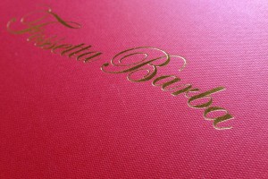 シックなエンジ系赤にエンボス柄でマット調の地に金色の文字が浮かび上がります。